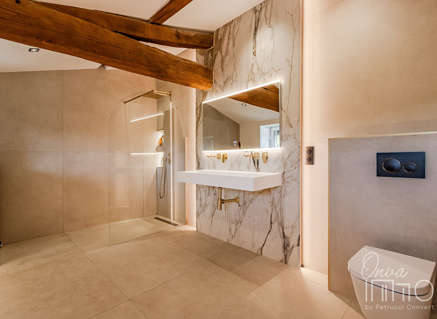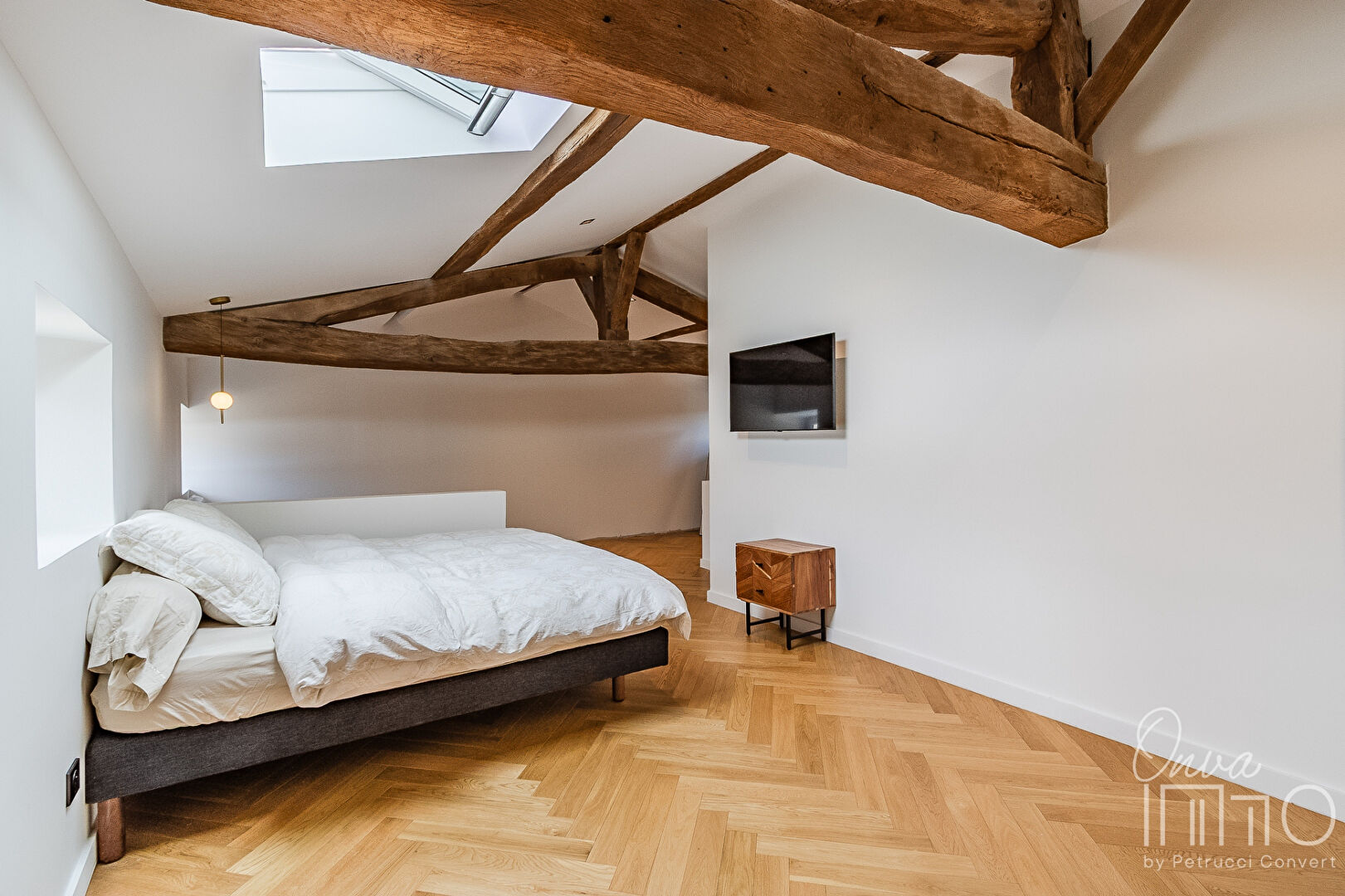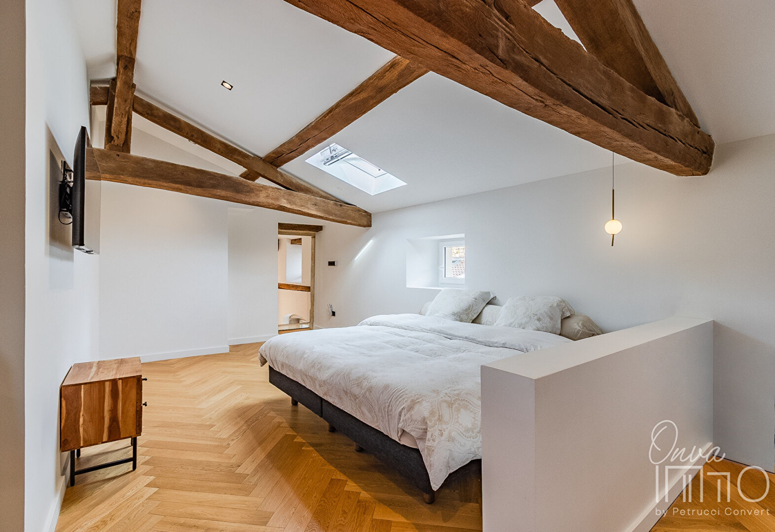 – Puis, au dernier étage qui offre une intimité complète aux parents avec une suite parentale d’exception de 42m² précédée d’un espace détente de 13m² avec sa belle hauteur sous plafond et son ouverture sur l’escalier. Cette lumineuse suite traversante Est/Ouest se déploie en trois espaces : la chambre à coucher ouverte sur le dressing qui reste à accueillir et la salle de bains.
