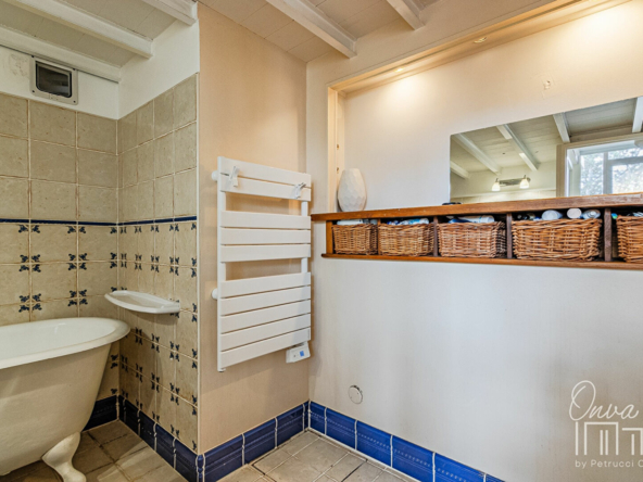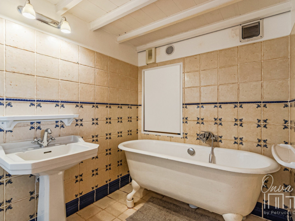 – d’une salle de bain au charme d’antan avec ses carreaux et sa baignoire sur pieds et de WC séparés.