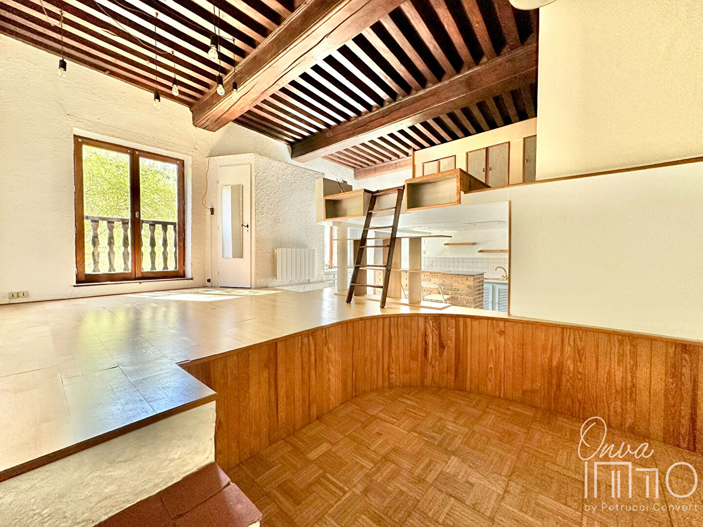 – d’une chambre de 11m² en mezzanine ouverte sur la pièce de vie avec son linéaire de rangements et sa salle de bains.