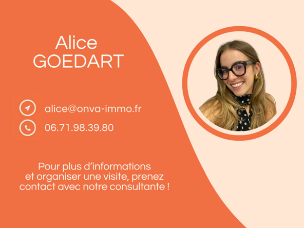 Pour plus d’informations, photos et plans, prenez contact avec notre consultante Alice Goedart, agent commercial, immatriculée au RSAC de Lyon sous le numéro 999 654 387, au 06/71/98/39/80.